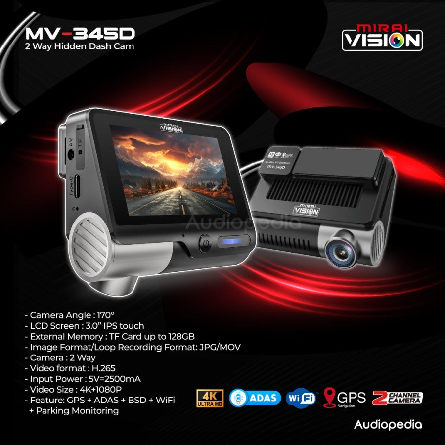 Mirai Vision Dashcam MV 345D merupakan dashcam DVR yang memiliki resolusi 4K dengan 2-channel lensa. Dashcam atau DVR adalah perangkat keamanan kamera video yang dipasang di atas dashboard mobil. Tujuan utama yakni merekam gambar dan video dari perspektif pengemudi selama perjalanan, dan membantu jika teman teman perlu klaim asuransi atau memberikan bukti tentang kejadian penting seperti kecelakaan, atau situasi darurat lainnya.